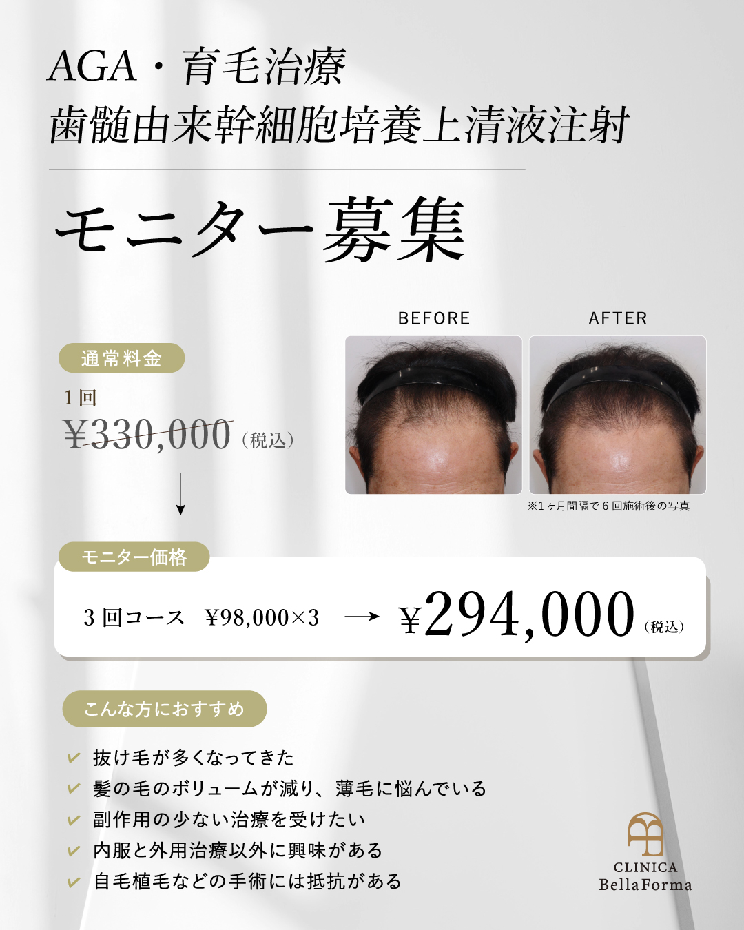 当院では、AGA治療として、歯髄由来幹細胞培養上清液のモニター募集をしております。