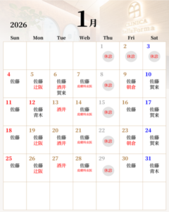 news 2025.12.27 2026年1月の診療スケジュールについて 2026年1月の診療スケジュールは下記の通りです。 ↓こちらの画像をクリックすると表示が大きくなります。 clinicabellaforma facebook Line twitter google