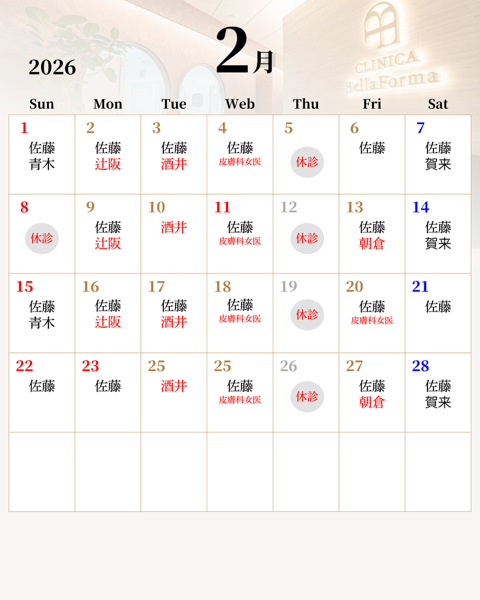 news 2026.01.24 2026年2月の診療スケジュールについて 2026年2月の診療スケジュールは下記の通りです。 ↓こちらの画像をクリックすると表示が大きくなります。 clinicabellaforma facebook Line twitter google