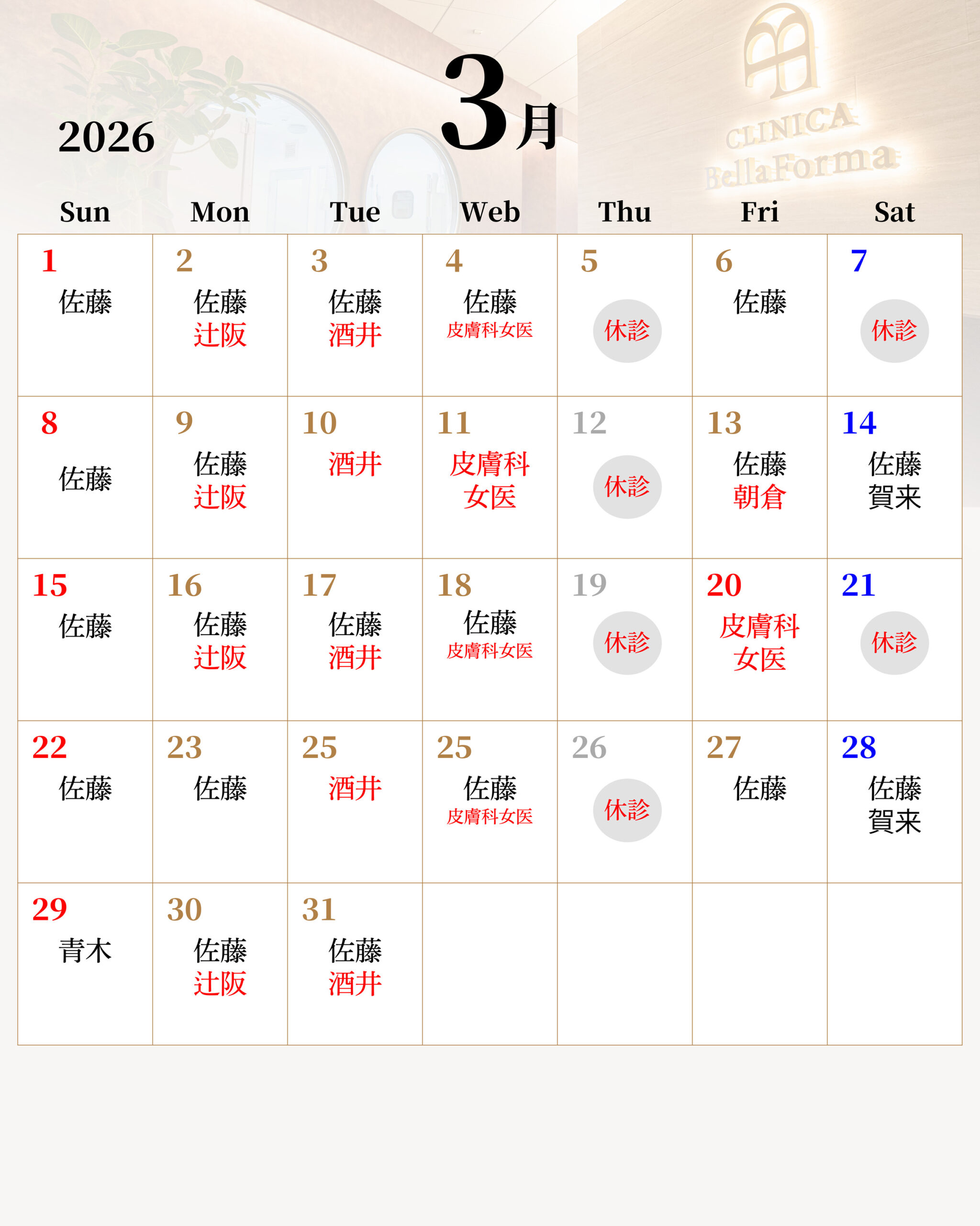 news 2026.02.16 2026年3月の診療スケジュールについて 2026年3月の診療スケジュールは下記の通りです。 ↓こちらの画像をクリックすると表示が大きくなります。 clinicabellaforma facebook Line twitter google